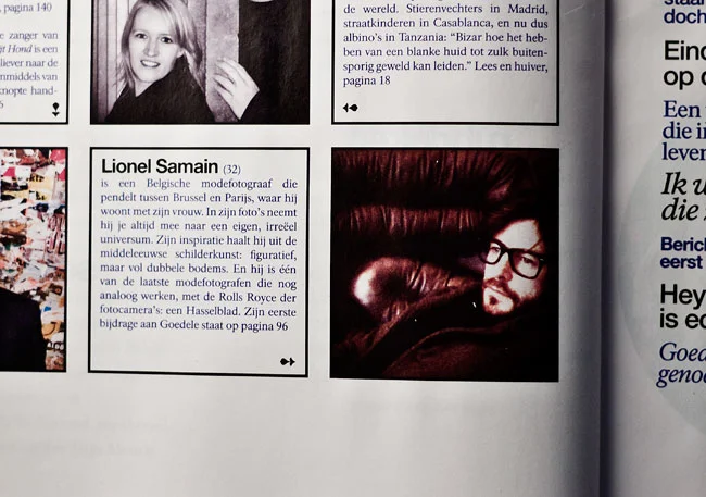 I'm not used to publish scans of pages from magazines but there is a start for everything. I shot recently an editorial serie for belgium magazine Goedele and they have this habit to spread few words about their collaborators. My wife laughed a lot when she discovered the picture I sent as my portrait. Well, first publication of a picture taken by an iphone camera. Let's celebrate!
